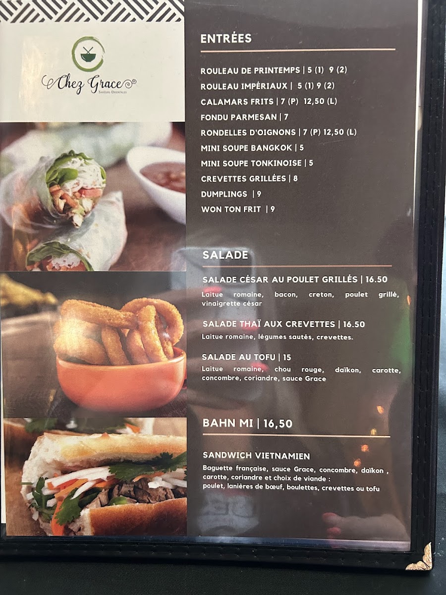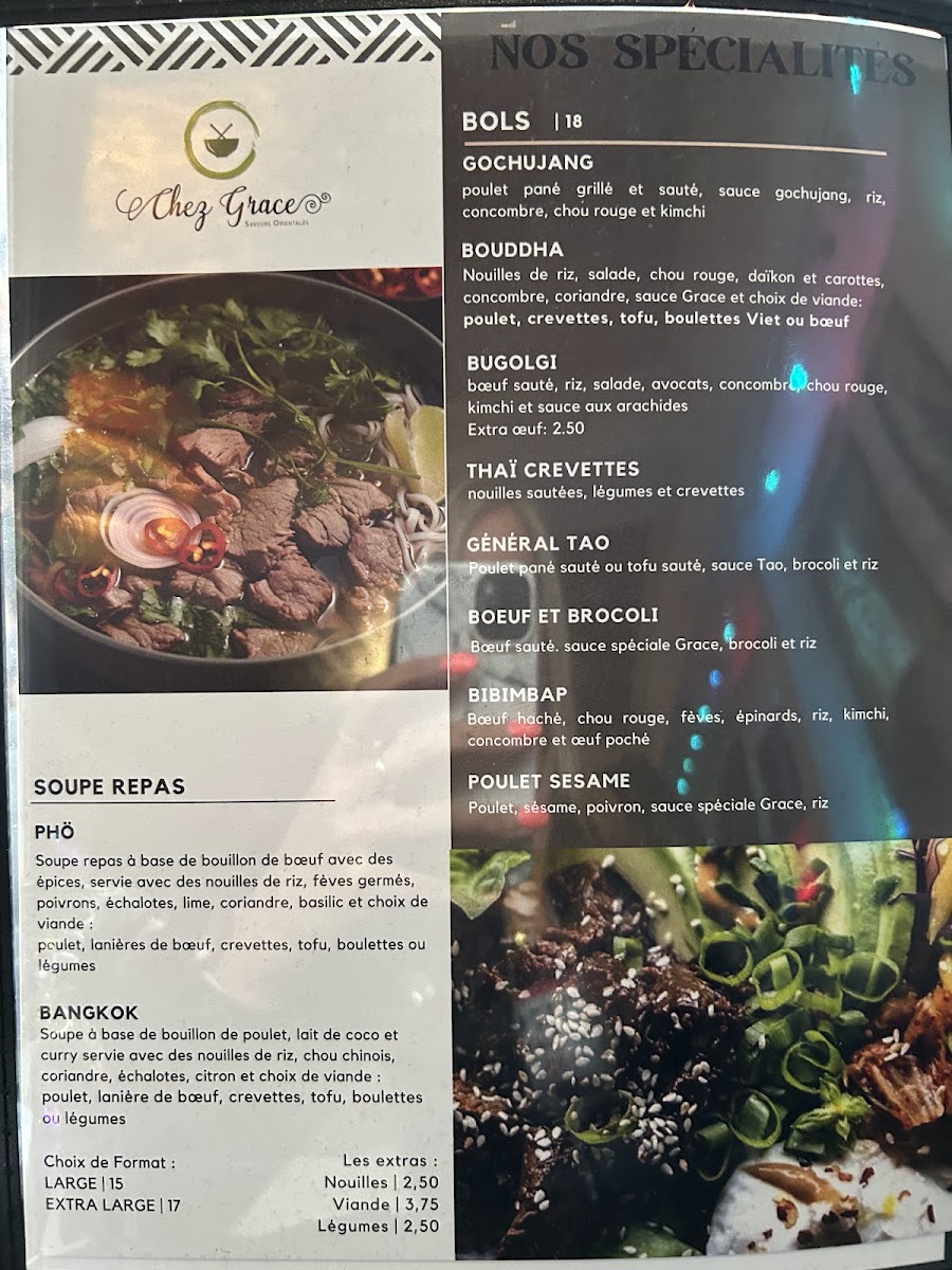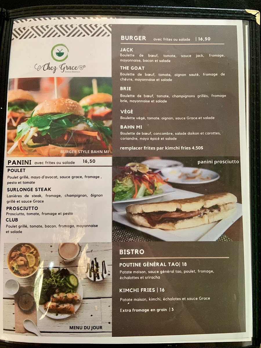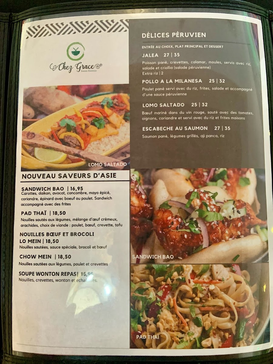 The menu at Restaurant Chez Grace offers a diverse and flavorful selection, perfect for anyone craving a mix of Asian, Peruvian, and comfort food. For those seeking a hearty meal, the SOUPE REPAS section features dishes like PHÖ and BANGKOK, offering a taste of Southeast Asia. Their specialty items include bold and flavorful choices like GOCHUJANG, BOUDDHA, and BUGOLGITHAÏ CREVETTES, as well as the popular GÉNÉRAL TAO. The DÉLICÉS PERUVIEN section brings in delicious options such as JALÉA, POLLO A LA MILANESA, and LOMO SALTADOESCABECHE AU SAUMON, all infused with vibrant Peruvian flavors. For those looking to explore fresh and new Asian tastes, the NOUVEAU SAVEURS D'ASIE offers choices like SANDWICH BAO, PAD THAÏ, and NOUILLES SAUCE BROCOLICHOW MEIN. The menu also boasts an assortment of ENTRÉES, including ROULEAU DE PRINTEMPS, ROULEAU IMPÉRIAUX, and crispy CALAMARS FRITS. For a lighter option, the salads like SALADE CÉSAR AU POULON GRILLÉ and SALADE AUX LÉGUMES SAUTÉS are perfect. If you’re in the mood for a sandwich or burger, the BAHN MI offers the signature SANDWICH VIETNAMIEN, while the BURGER section features tasty options such as JACK, THE GOAT, and BRIEVÉGÉ. Their PANINI menu also delivers with choices like POULET and SURLONGE STEAK. Lastly, their BISTRO options, including POUTINE GÉNÉRAL TAO and KIMCHI FRIES, offer a comforting twist on classic dishes. With such an array of dishes, there's something for everyone at Chez Grace.