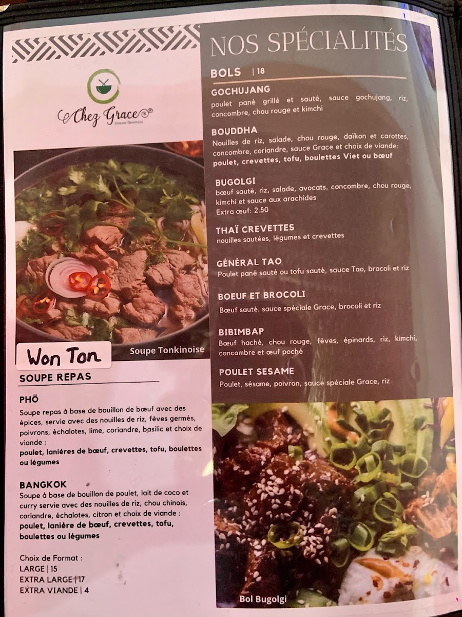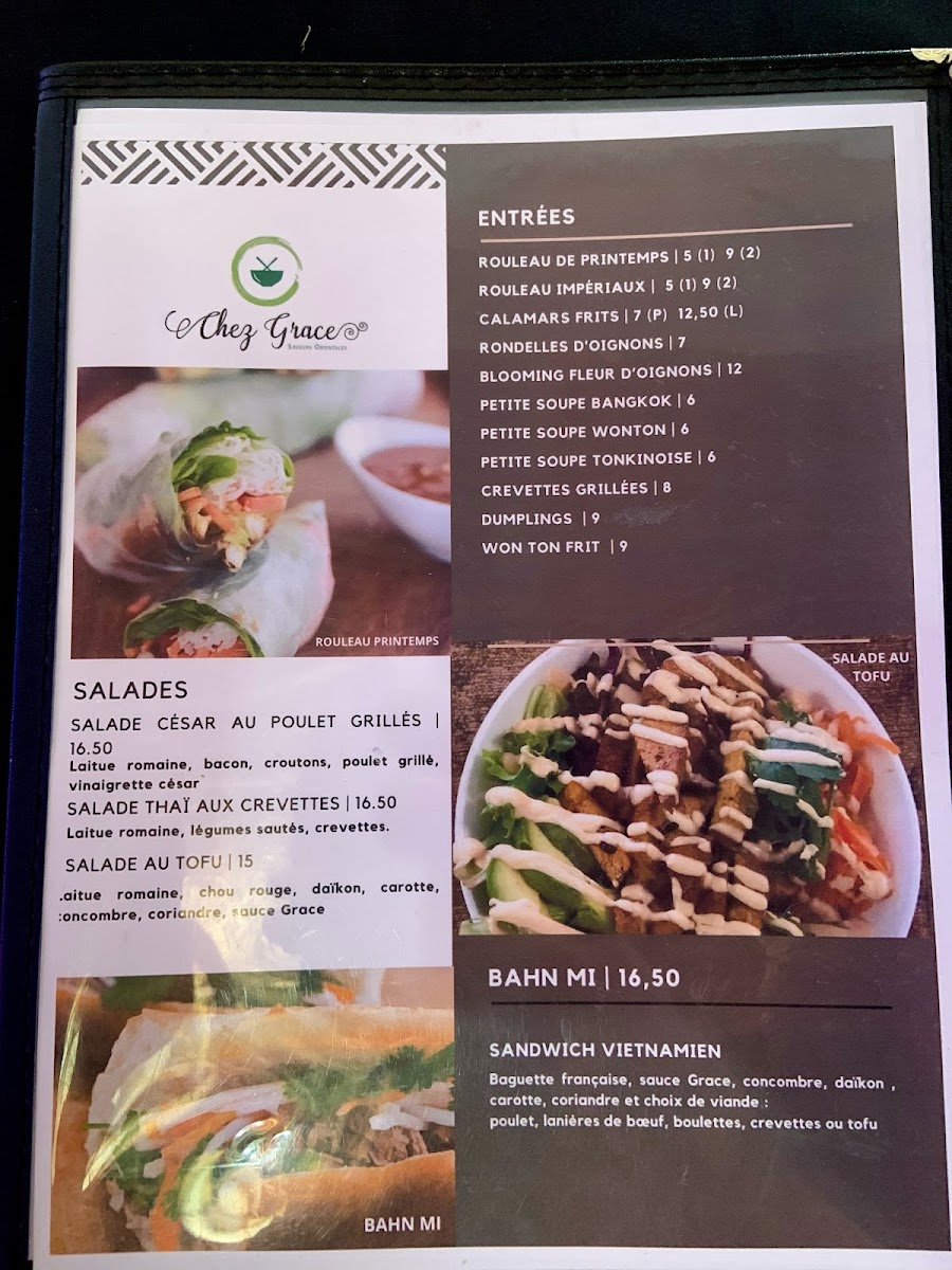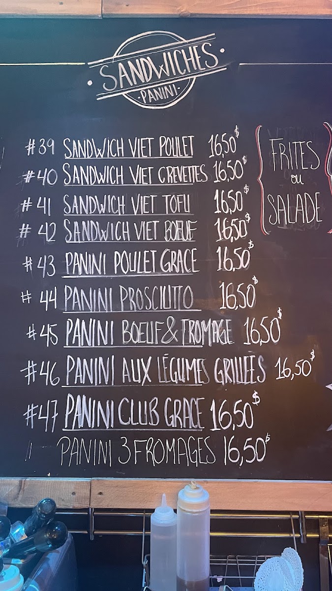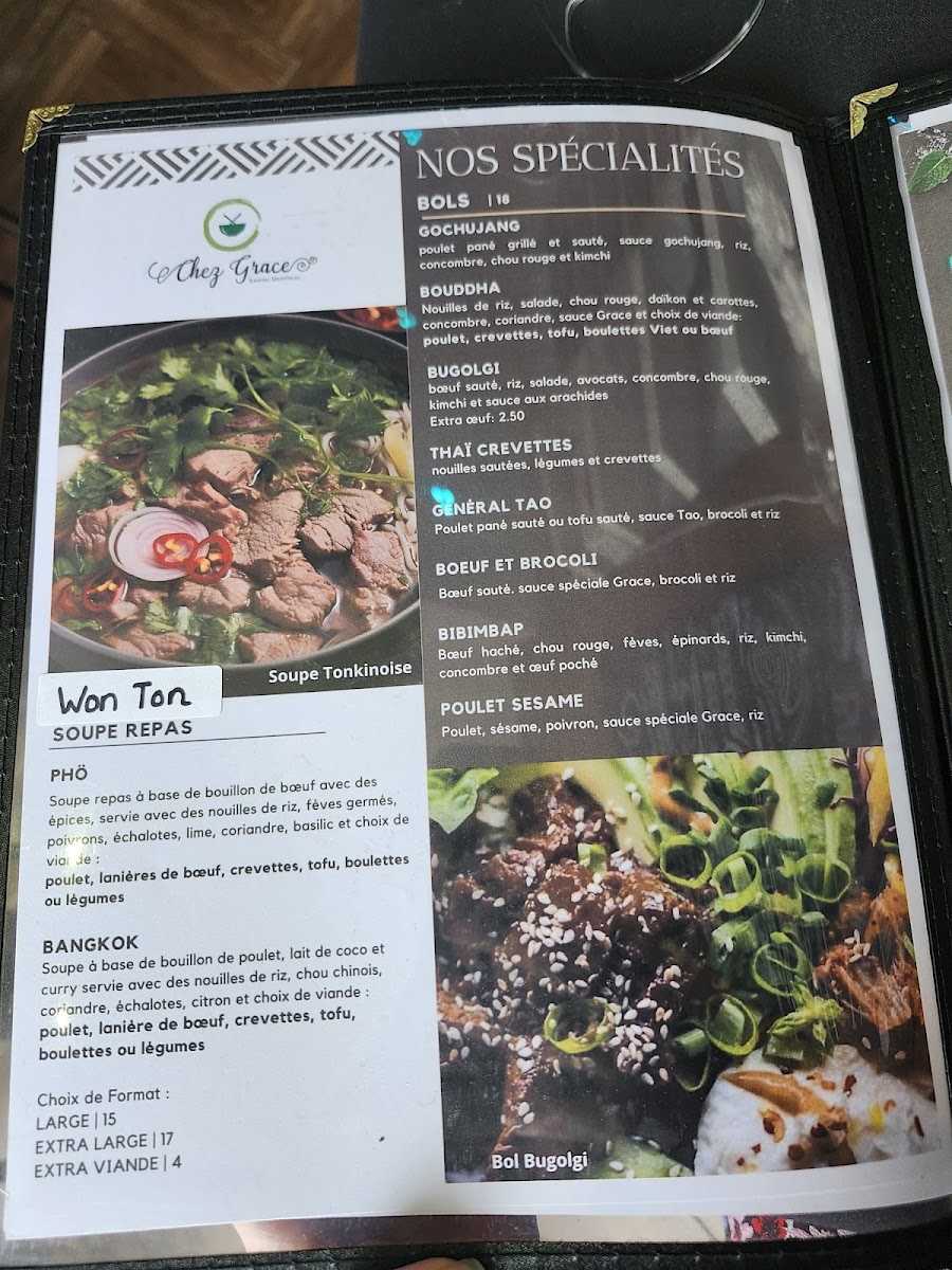 The menu at Restaurant Chez Grace offers a diverse and flavorful selection, perfect for anyone craving a mix of Asian, Peruvian, and comfort food. For those seeking a hearty meal, the SOUPE REPAS section features dishes like PHÖ and BANGKOK, offering a taste of Southeast Asia. Their specialty items include bold and flavorful choices like GOCHUJANG, BOUDDHA, and BUGOLGITHAÏ CREVETTES, as well as the popular GÉNÉRAL TAO. The DÉLICÉS PERUVIEN section brings in delicious options such as JALÉA, POLLO A LA MILANESA, and LOMO SALTADOESCABECHE AU SAUMON, all infused with vibrant Peruvian flavors. For those looking to explore fresh and new Asian tastes, the NOUVEAU SAVEURS D'ASIE offers choices like SANDWICH BAO, PAD THAÏ, and NOUILLES SAUCE BROCOLICHOW MEIN. The menu also boasts an assortment of ENTRÉES, including ROULEAU DE PRINTEMPS, ROULEAU IMPÉRIAUX, and crispy CALAMARS FRITS. For a lighter option, the salads like SALADE CÉSAR AU POULON GRILLÉ and SALADE AUX LÉGUMES SAUTÉS are perfect. If you’re in the mood for a sandwich or burger, the BAHN MI offers the signature SANDWICH VIETNAMIEN, while the BURGER section features tasty options such as JACK, THE GOAT, and BRIEVÉGÉ. Their PANINI menu also delivers with choices like POULET and SURLONGE STEAK. Lastly, their BISTRO options, including POUTINE GÉNÉRAL TAO and KIMCHI FRIES, offer a comforting twist on classic dishes. With such an array of dishes, there's something for everyone at Chez Grace.