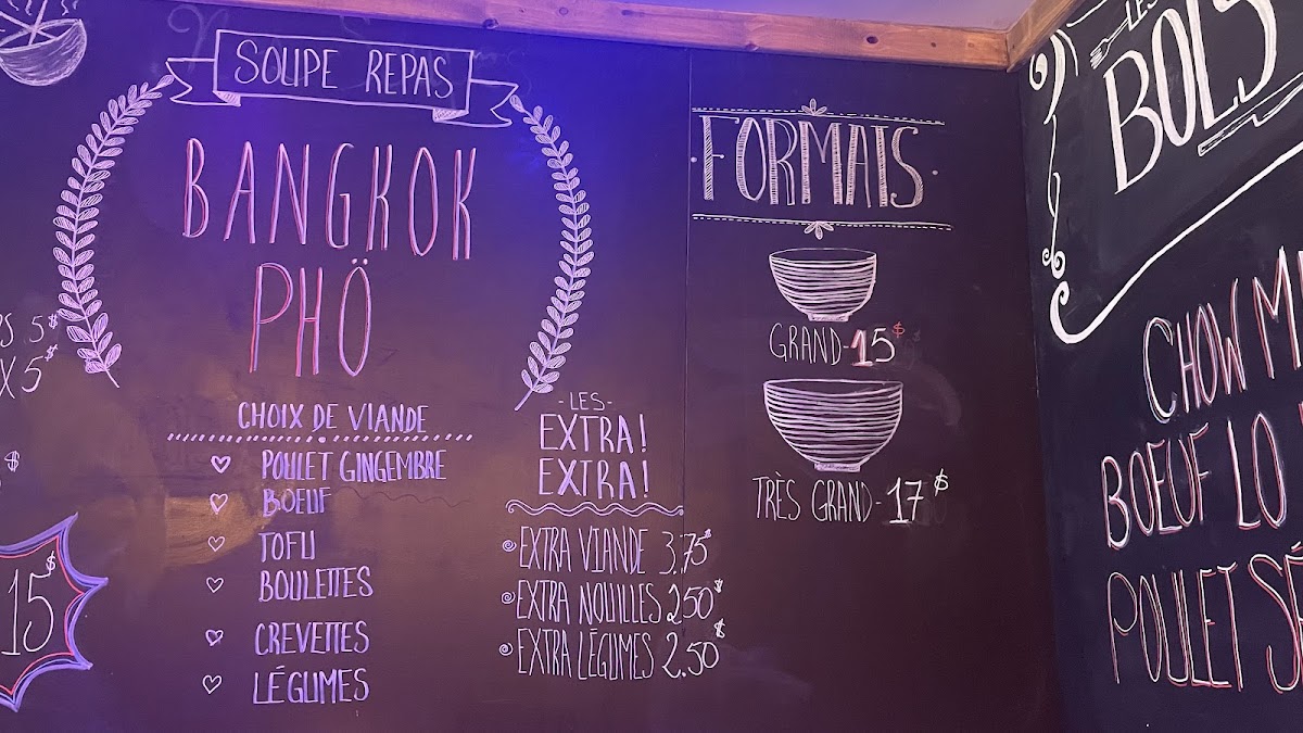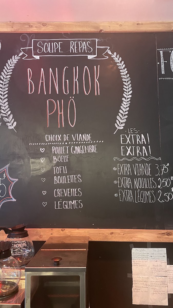 Soupe repas à base de bouillon de bœuf avec des épices, servie avec des nouilles de riz, fèves germés, poivrons, échalotes, lime, coriandre, basilic et choix de viande : poulet, lanières de bœuf, crevettes, tofu, boulettes ou légumes